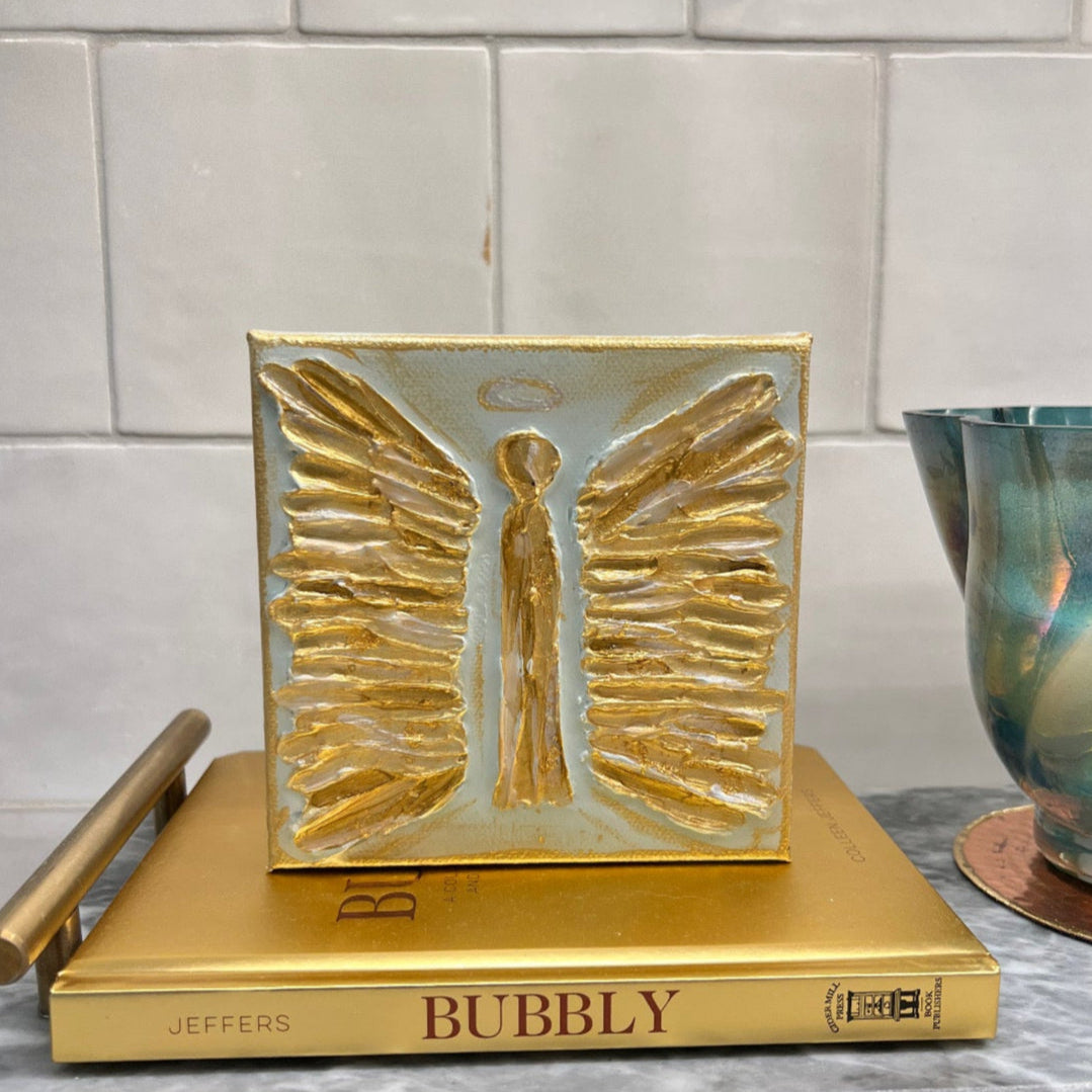 Our beautiful Angel has a pearl, distressed, background with a gold angel and canvas outline. A 5" x 5" wooden canvas that is finished with resin, giving it a shiny appearance. Perfect for any occasion!